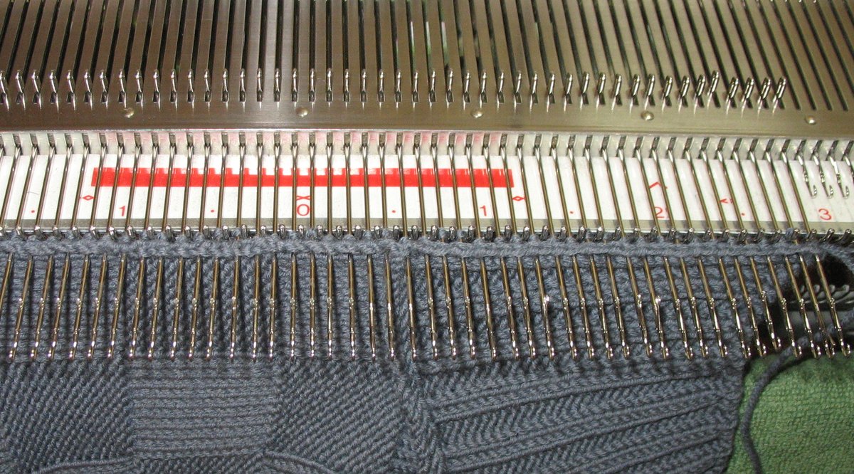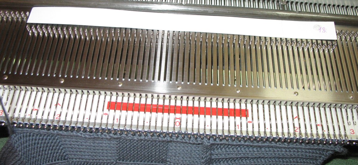 Итак. Связали планку, перенесли все петли с передней игольницы на заднюю. Теперь выдвигаем 2-3 иглы по краям планки и в контрольных точках в ПНП. В даннном случае контрольной точкой было место кетлевки воротника.