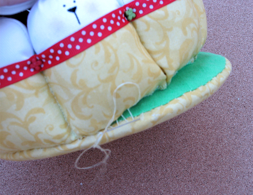 Садим наших зайцев попками на донышко и пришиваем потайными стежками. Я обычно прохожусь дважды. Первый раз по часовой стрелки, второй-против (или наоборот :) Если ткань хорошего качества и имеется некоторый опыт шитья-проблем возникнуть не должно. Если ткань рыхлая или не получается аккуратно, этот шов можно задекорировать также, как и верхний. Если это кружево-пришить, если тесьма-приклеить горячим (или каким-то другим) клеем.