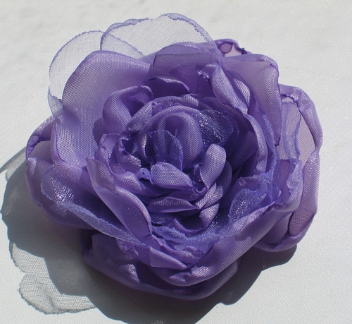У меня цветок выполнен и тончайшего жатого шифона двух цветов: фиолетового и пестро-геометричного. Ткань может использоваться любая, но несильно плотная.