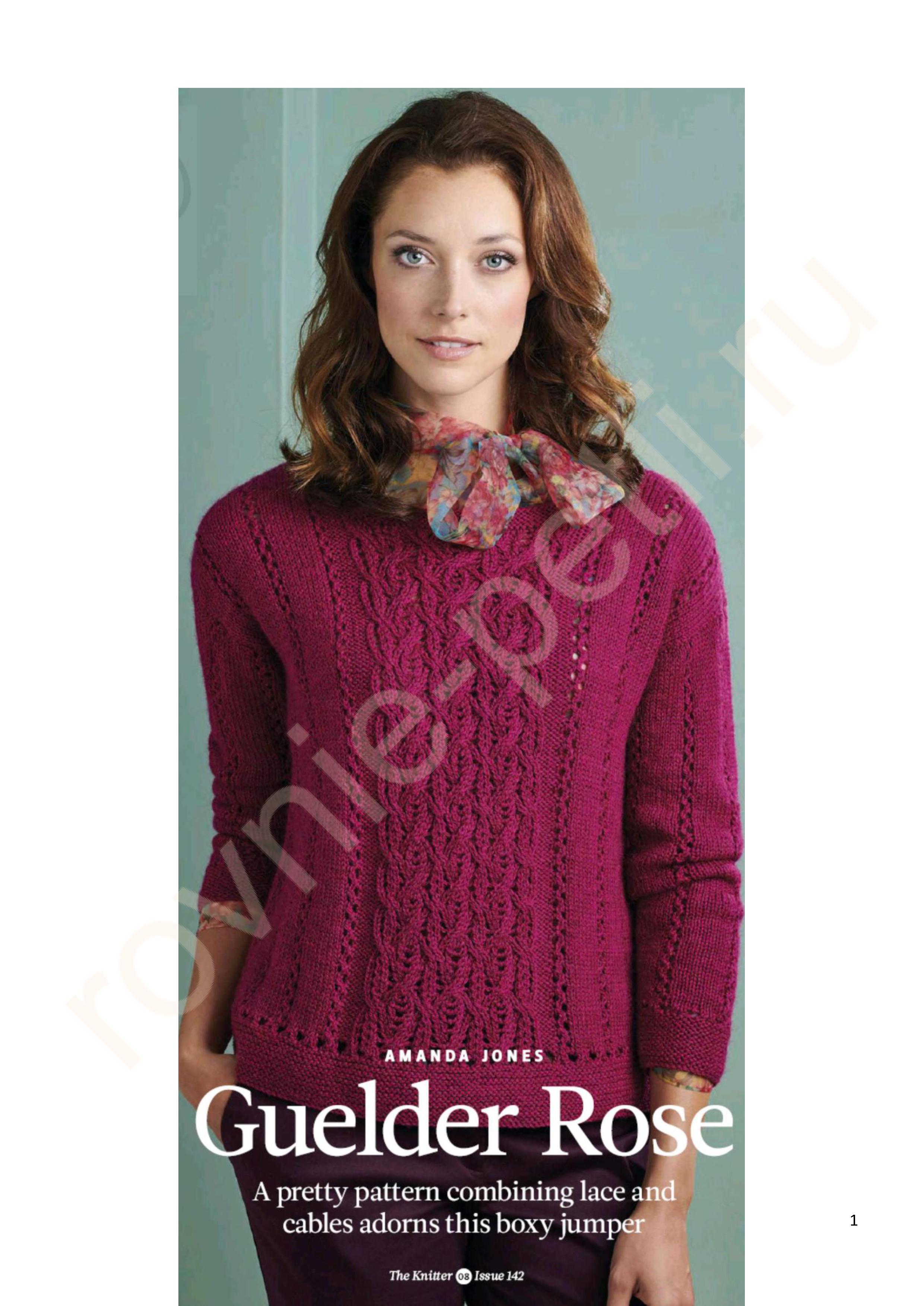 Джемпер вяжется по кругу снизу вверх. Перед джемпера украшен рельефным и ажурным узорами. Для вязания джемпера спицами можно использовать мягкую шерстяную пряжу метражом около 200-220 м в 100 г, например, Drops Merino extrafine, Alize Merino royal, Naturafil Paloma.