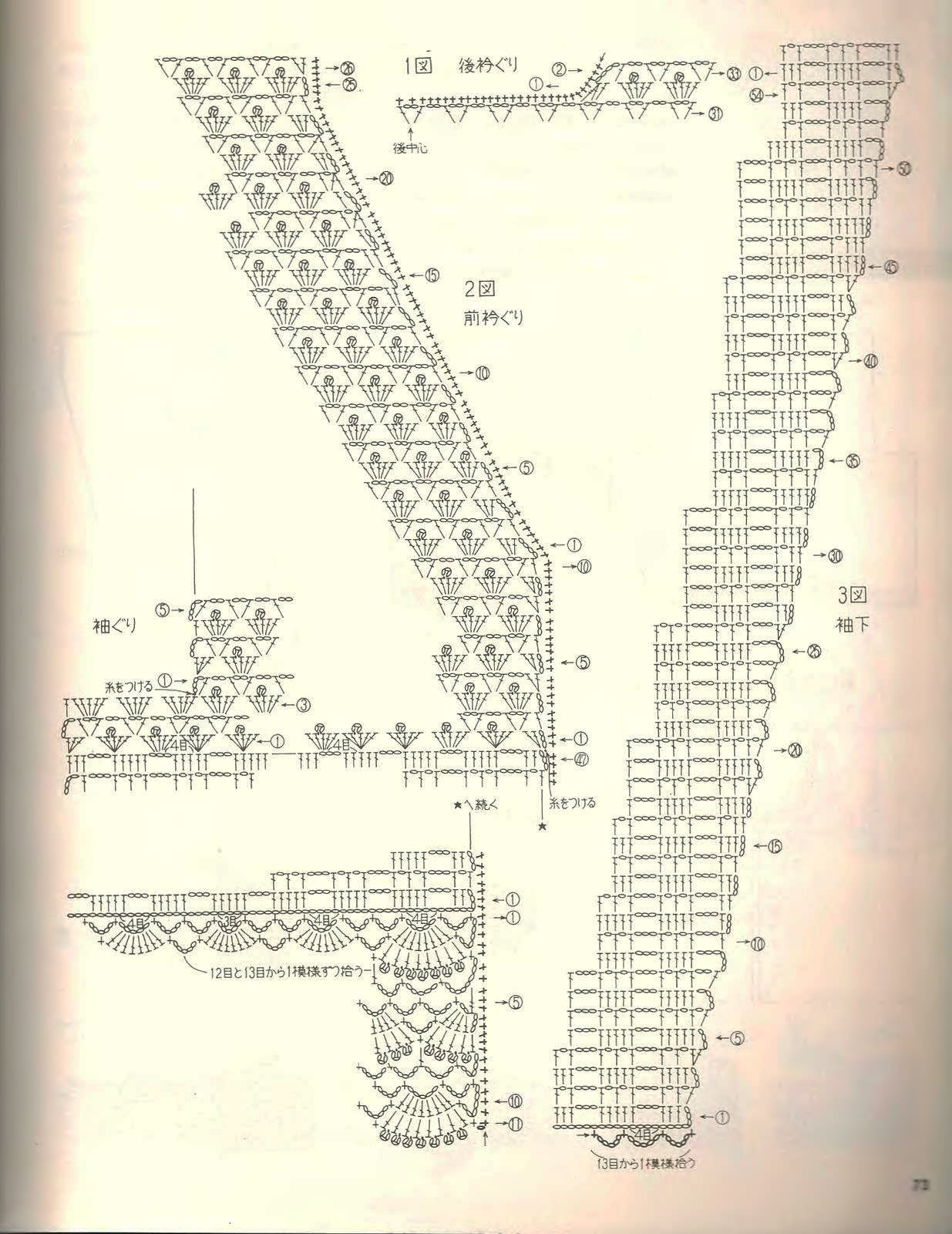 Топ совсем простой, но узор выглядит необычно за счёт диагональных накидов. Соответствующие убавления делаются в противоположные стороны от планки. На схеме — правая часть топа.