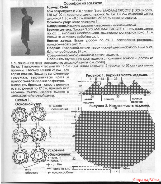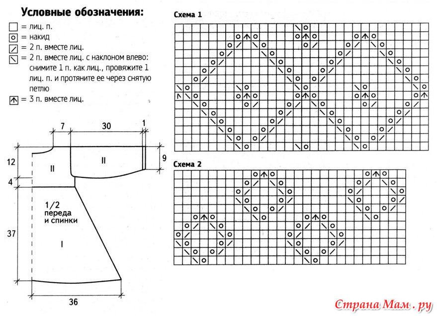 Внимание! Ажурный узор вяжите согласно схеме 6 с 1-го по 48-й ряды, затем повторяйте с 15-го по 48 ряды. В схеме даны только лицевые ряды. В изнаночных рядах все петли и все накиды вяжите изнаночными петлями. Чтобы не образовывались отверстия – при смене пряжи необходимо перекрещивать нити. На высоте 34 см от нижнего края закройте с обеих сторон для пройм сначала по 4 п., затем 1 раз 2 п. и 2 раза по 1-й п. в каждом 2-м ряду. Через 16 см от начала пройм для выреза горловины закройте средние 31 п. и обе части довяжите отдельно. Одновременно с началом выреза для скоса плеча закройте по краю 1 раз 7 п., затем 3 раза по 7 п. в каждом 2-м ряду.