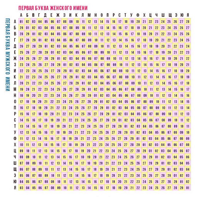 Многие люди любят читать гороскопы совместимости. Порой это действительно поднимает настроение. Если вы из тех людей, которым это не чуждо, то мы предлагаем вам таблицу совместимости, которая основывается на первых буквах имен партнеров. Итак, найдите свои буквы и определите цифру, которая расскажет о том, какими будут ваши отношения в браке!