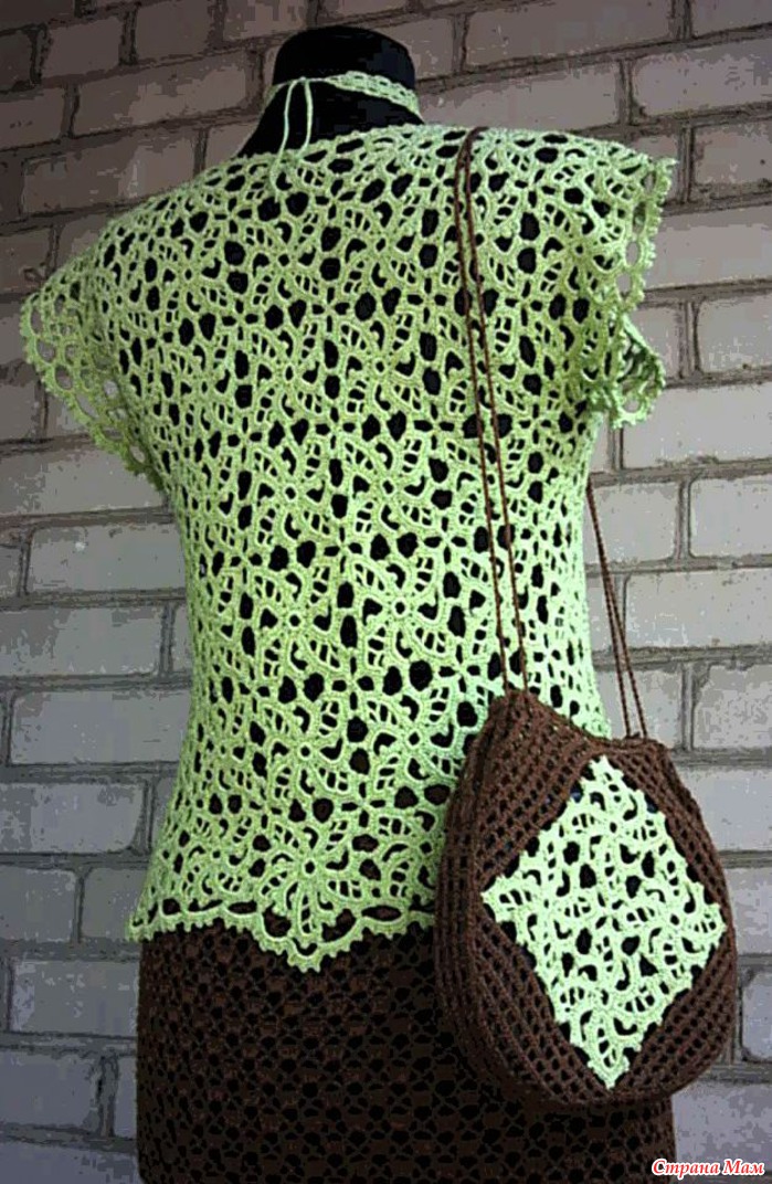 На кофточку, топик и сумочку ушло 300 грамм пряжи MAXI Viscose (72% хлопок,28% вискоза, 415м/100г) салатового цвета и немного коричневого для сумочки...