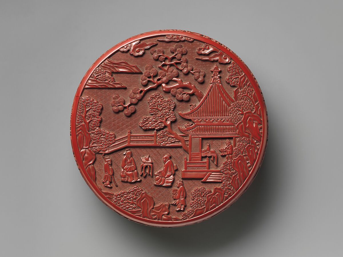 На крышке этой коробки пара сидящих мужчин отдыхают на веранде с видом на водоем. Один играет китайский цитру (Цинь), а другой слушает. Трио служителей, один в соседнем павильоне, также наслаждаются музыкой. Сцены, изображающие культурный образ жизни и художественные навыки научного класса, стали повсеместными в китайской живописи и декоративно-прикладном искусстве после XIV века