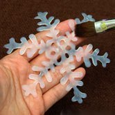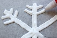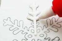 Трафареты надо накрыть сверху бумагой для выпечки или вложить в файлики и обвести толстым слоем рисунки клеем ПВА. Удобнее всего это делать, набрав клей в шприц. Примечание: рисунки для трафаретов лучше брать без множества мелких "внутренних" деталей и достаточно крупные, так как клей немного растекается и можно получить вместо изящного узора сплошное прозрачное пятно.