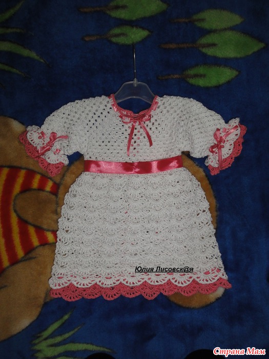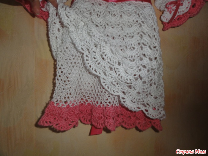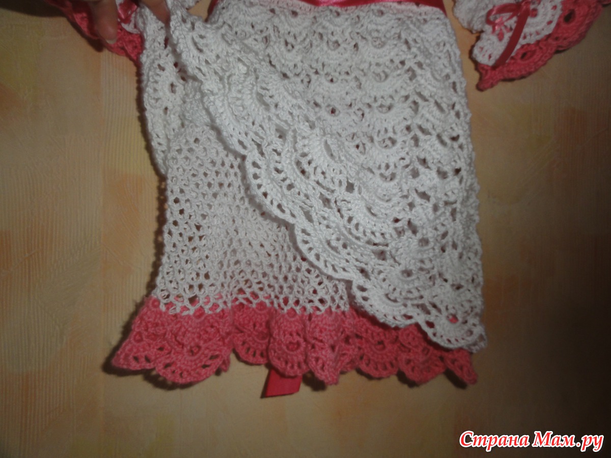 Чтобы юбочка не была слишком прозрачной, решила внутри связать второй ярус юбки. Обвязала рюшей, которую в последствии повторила и на рукавах и в берете. Выглядело вот так: