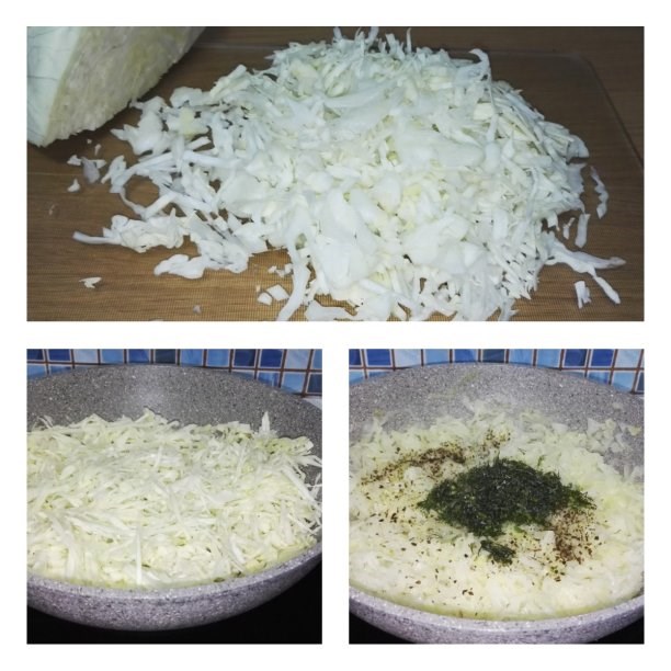 Капусту мою и тонко шинкую. Наливаю в сковороду 2 ст. л. растительного масла и 150 мл (примерно 6 ст. л.) воды. Выкладываю капусту, накрываю крышкой и тушу на слабом огне до мягкости, помешивая. Добавляю в капусту нарезанный укроп за минуту до конца приготовления, соль, перец и базилик. Остужаю капусту до комнатной температуры.