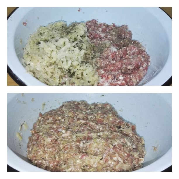 Мясо мою, обсушиваю, нарезаю кусочками. Лук и чеснок очистить. Пропускаю его через мясорубку с очищенным луком и чесноком. Соединяю капусту с фаршем. Солю, перчу еще немного. Вымешиваю.