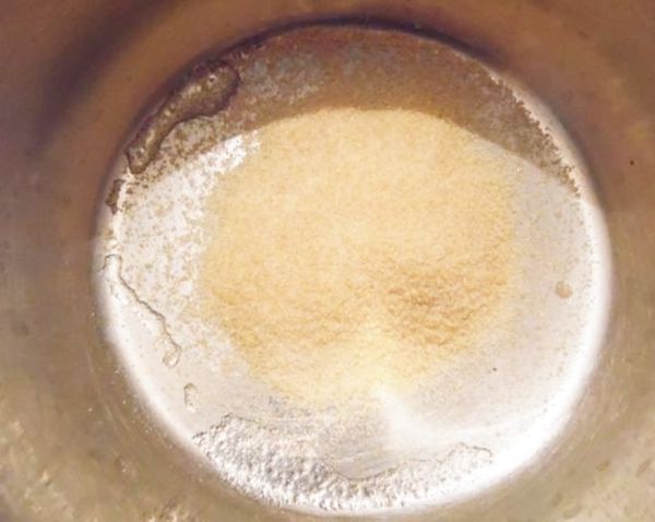 Шаг 1: Желатин залить в сотейнике водой и довести до кипения, но не кипятить, постоянно помешивая, до полного растворения. Оставить желатин полностью остыть.
