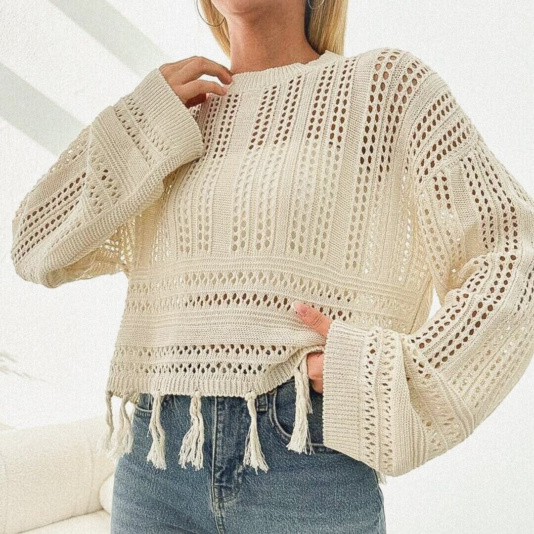 Ажурный полупрозрачный джемпер свободной посадки, украшенный бахромой по нижнему краю.