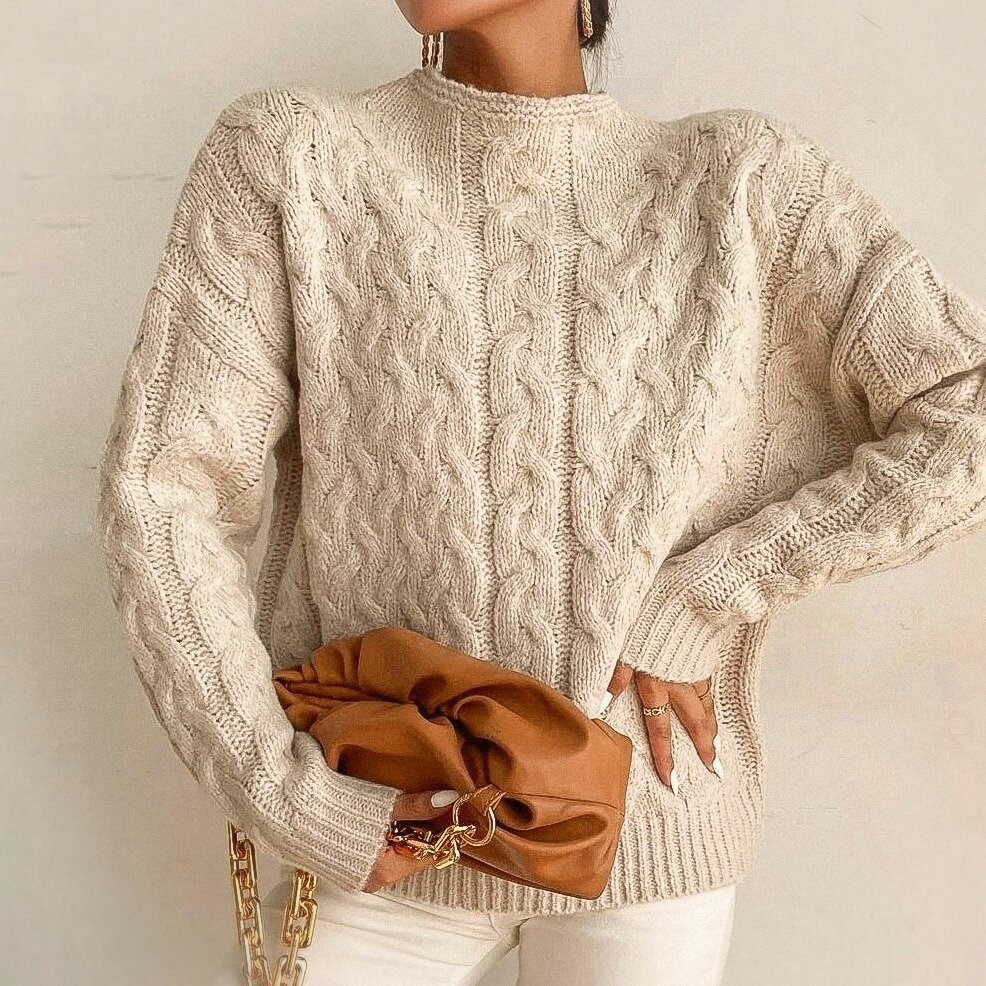 Модель .украшенная косами и переплетениями по всей площади — уютный кремовый джемпер свободного фасона со спущенными рукавами и горловиной стойкой.