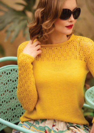 Джемпер связан круговыми рядами снизу вверх. Чтобы выполнить подгибку низа, для начала вязания используйте бросовую нить. Обтачка горловины также складывается пополам и пришивается во время сборки изделия.