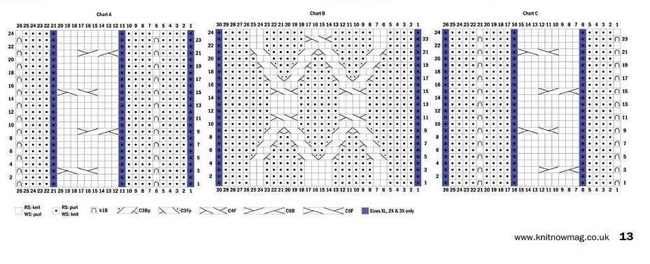 А это - схема рельефного узора по бокам свитера (он расположен между полосами из двух лицевых петель. Петли, выделенные розовым цветом, судя по фото узора крупным планом, снимаются не провязанными (нить отается на изаночной стороне вязания.
