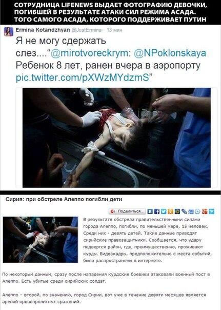 Так, сегодня, 12 июня 2014 года, российские СМИ распространили информацию о том, что украинские силовики якобы использовали фосфорные бомбы против мирного населения. В подтверждение этого российское ТВ использовало кадры, снятые в 2004 году в городе Эль–Фаллуджа, Ирак. (https://www.youtube.com/watch?v=qxfPCPA2d60 )