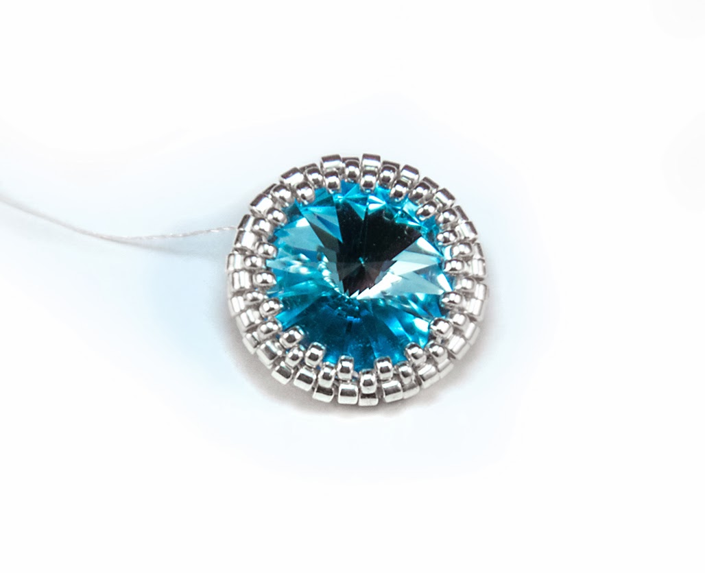 3. Берем круглый бисер размера 15/0, проплетаем еще два ряда и вставляем кристалл.