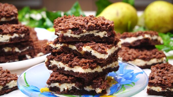 5. Теперь у нас есть два пути: вариант повседневный и праздничный. Для повседневного нам достаточно перемазать коржи горячим кремом. Верх и бока торта тоже щедро смазываем кремом и обсыпаем крошкой.