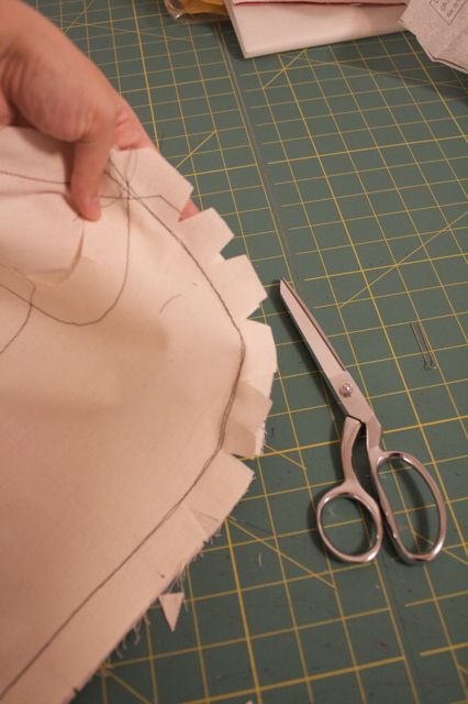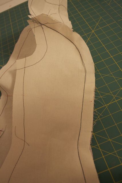 Выкраиваем детали подкладки в двух экземплярах. Один из дешёвого, другой красивый.))) Раскладываем основу на шерстин, при этом шерстин не доходит до низа основы подкладки на величину подгибки низа. (я крою в один слой). Накалываем булавками. Очень удобно сразу расчертить деталь основы под простёжку, тогда вырезав, можно сразу класть под машину.( потому в один слой)