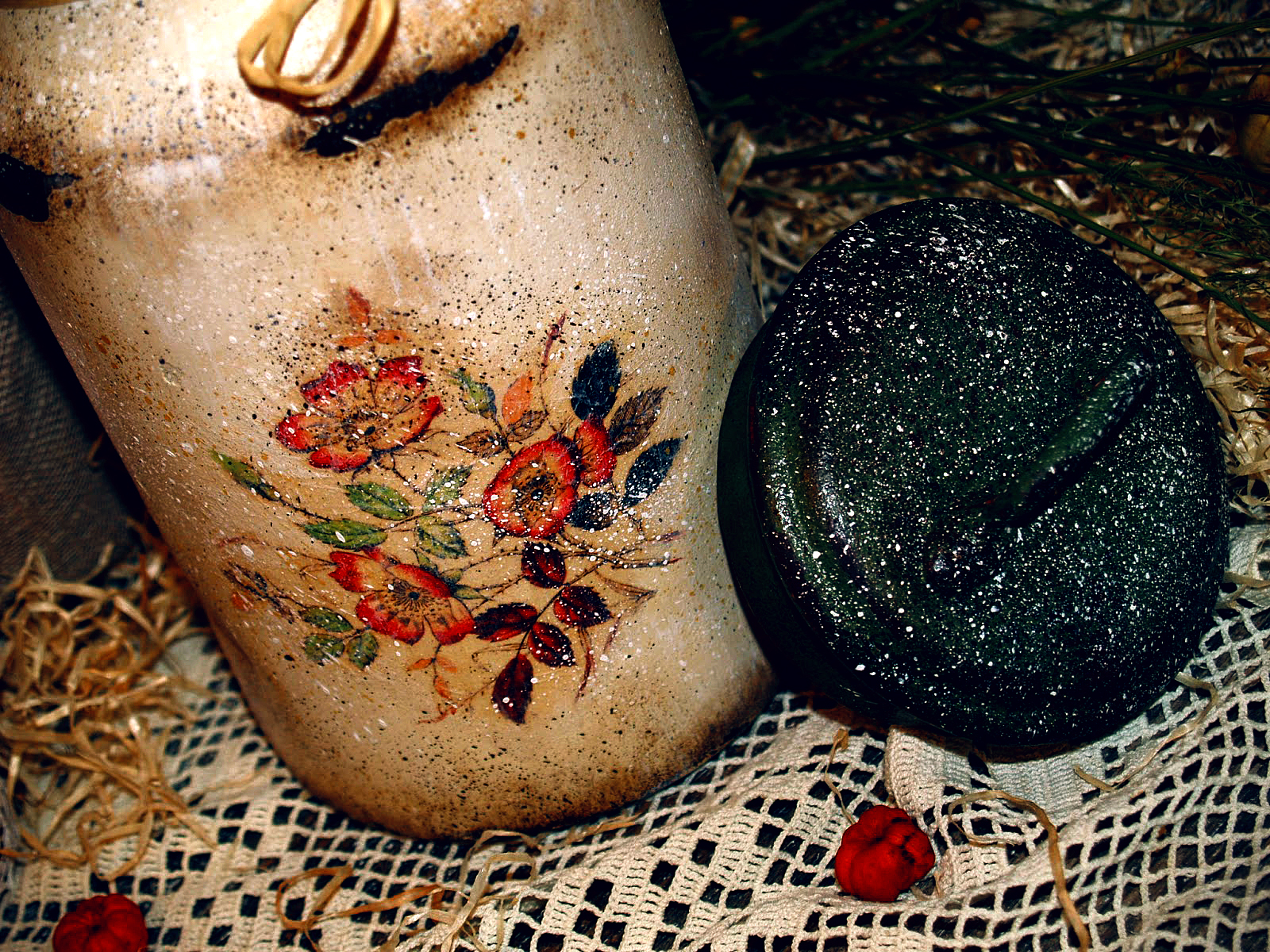 На боковинках - текстурная паста через трафарет и потертости.