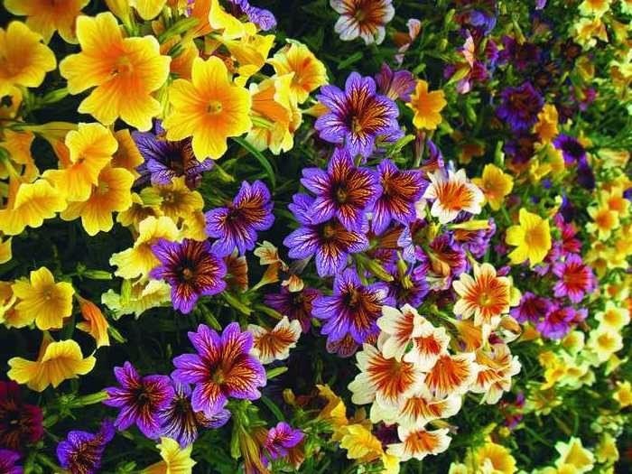 Сальпиглоссис – Salpiglosis Ruiz et Pav – семейство пасленовых. Род представлен восемью видами, распространенными в Южной Америке, в основном в Чили. Растения высотой 40-80см, покрытые железистыми волосками. Цветки воронковидные, бархатистые с пятилопастным отгибом, голубые, фиолетовые, коричневые, кремовые, желтые, красные с оригинальным рисунком в зеве и темными или золотистыми жилками на лепестках.