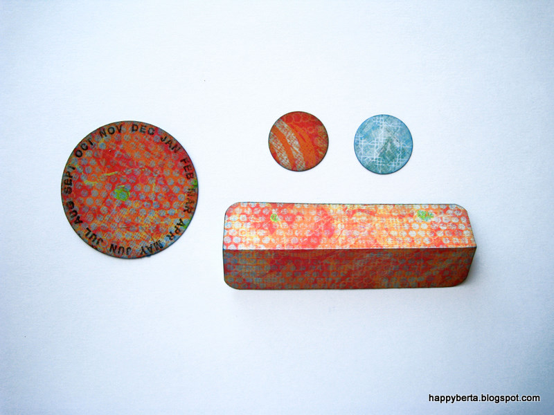 Из заготовки шириной 5 см вырезаем все оставшиеся детали конверта: полосу 9х4 см (сгибаем ее вдоль длинной стороны напополам), один круг диаметром 5 см и два – диаметром 2,5 см. Все детали тонируем. Обратите внимание, что большой и один из маленьких кругов мы используем оборотной стороной бумаги. Остатки бумаги могут пойти на украшения (я вырезала из них фигурными дыроколами цветы, бабочек и пр.)