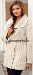 Вам потребуется: 200-250-250-300-300 г пряжи белого цвета (№ 0100) Alpaca (100% шерсть, 180 м/50 г), 150-150-200-200-200 г пряжи белого цвета (№ 06) Vivaldi (58%мохер, 19% шерсть, 23% полиамид, 280 м/50 г); прямые и круговые спицы № 7; крючок N 5; 3 пуговицы диаметром 2 см.