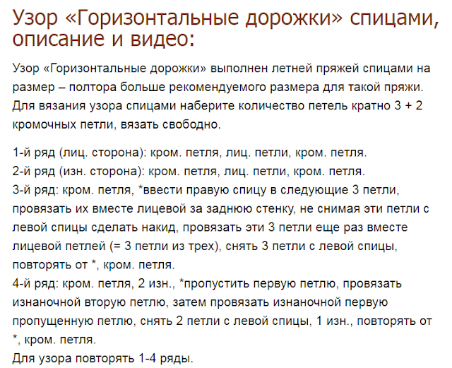 Простой узор спицами, узор плотный красивый и легкий. В рапорте узора две тепли и четыре ряда. Для образца узора нужно набрать количество петель кратное 2+2 кромочные петли