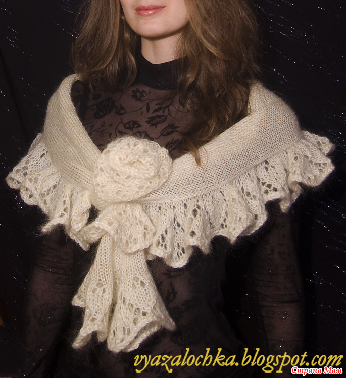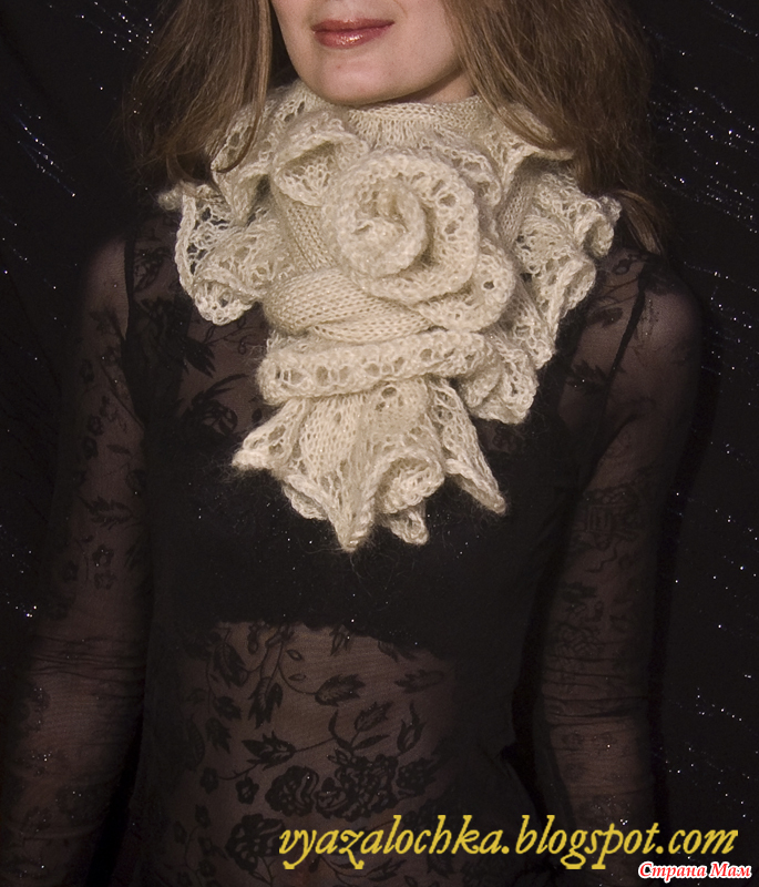 Цветок получается от скручивания "в трубочку" каймы короткой стороны шарфа (это делается за несколько секунд), при завязывании шарфа держится прекрасно и более ничем не фиксируется.