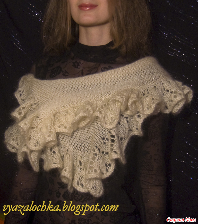 [показать]Вязание джемпера спицами ажурным узором из тонкого мохера с декоративным воротником.