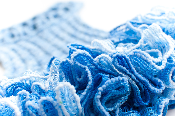 Пряжей Ализе Бамбу набираем заведомо большее количество петель, чем объем талии ребенка — 150 в.п. Юбка вяжется снизу вверх по кругу. Вяжем первый ряд столбиками без накида. Второй и следующие ряды с рюшами вяжем филейной сеткой: *столбик с накидом, 2 в.п.*, повторять от * до*. Через ряд включаем в вязание ленточную пряжу Ализе Дантелла, цепляя ее за край ленты (смотрите фото):