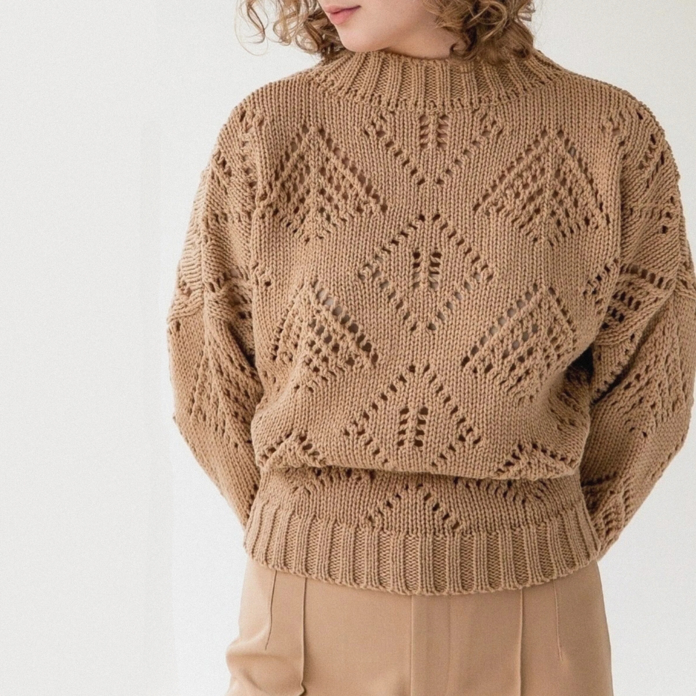 Симпатичный джемпер в приятном цвете капучино с ненавязчивым ажурным узором.