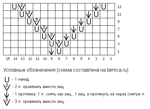 Как вязать спицами сетчатый узор:Число петель кратно 2 + 2 кром. п. Набрать 15 п. (2 + 6 + 5 + 2 кром. п.) и вязать согласно схеме, на которой приведены лицевые и изнаночные ряды. Раппорт узора = 6 п. в ширину. Начинать с кром. п. и 2 п. перед раппортом, постоянно повторять раппорт, закончить 5 п. после раппорта и кром. п. |