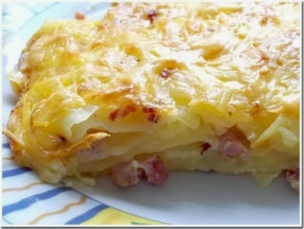 Копчёный окорок нарезать кубиками, чеснок мелко порубить, картофель нарезать тонкими ломтиками (чем тоньше тем лучше).