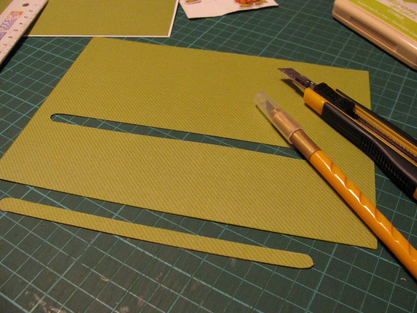 [показать] Сгибаем лист картона пополам. [показать] Вырезаем 2 прямоугольника из плотного зеленого картона, один приклеиваем на спинную сторону открытки (для прочности). [показать] На втором листе прорезаем при помощи канцелярского или макетного ножа прорезь (у меня 8 мм шириной, так как клеевые кружочки 6 мм). Старайтесь делать линии ровными, чтобы вращающийся элемент без помех крутился в этой прорези. [показать]