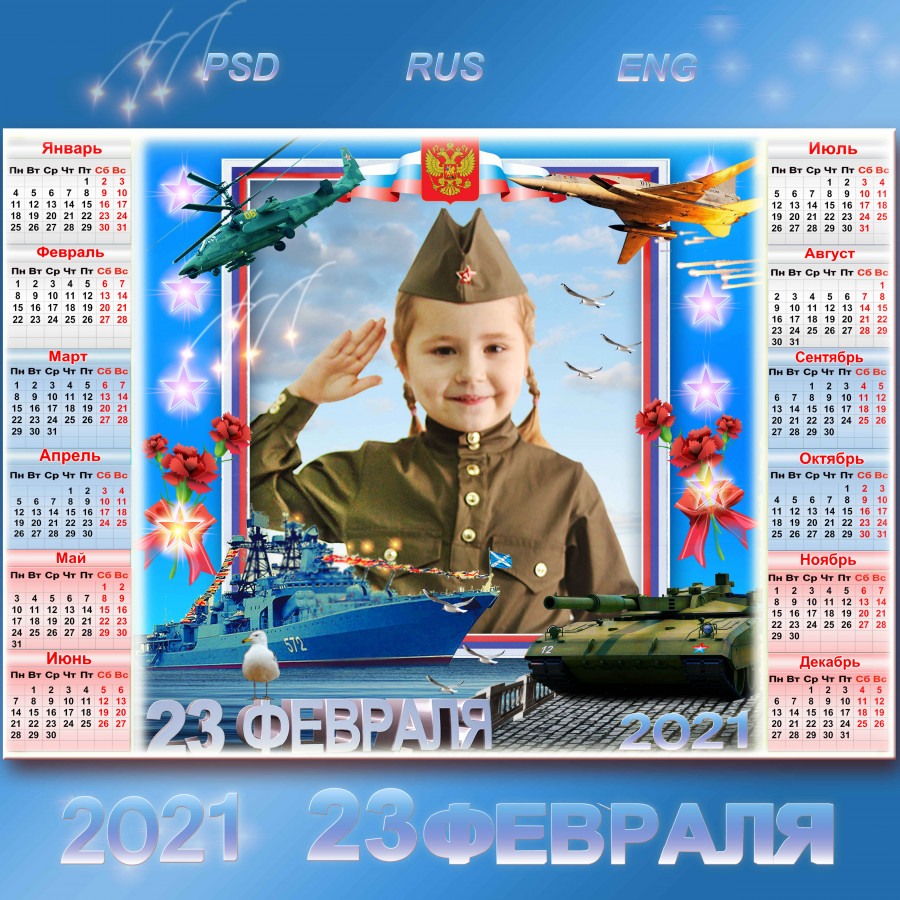 Праздничный календарь на 2021 год с рамкой для фото - 23 ФЕВРАЛЯ - красный день календаря!