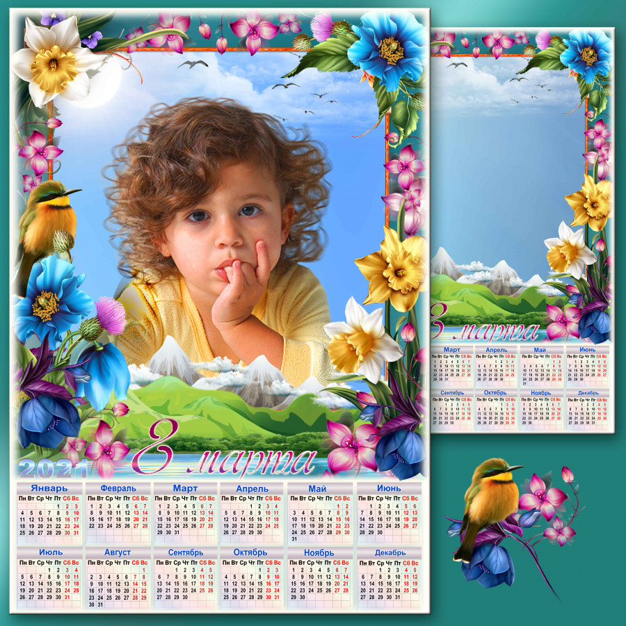 Праздничный календарь на 2021 год с рамкой для фото к 8 Марта - Альпийская весна