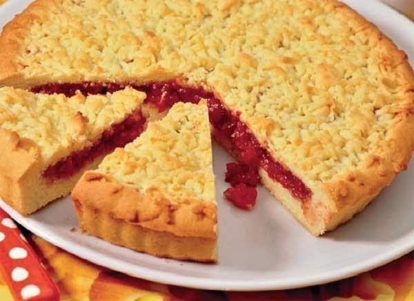 - Теперь выкладываем вторую часть равномерно на противень и ложем поверху слой варенья. Ровняем его аккуратно ложкой. После этого достаем вторую часть теста с морозилки и натираем его через крупную терку на варенья. Ставим противень на 20 минут в духовку. По истечению времени достаем песочный пирог с духовки и подаем в теплом виде к