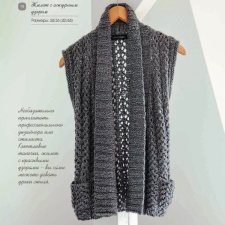 Модный и красивый жилет связанный спицами жгутами,которые к верху сужаются и переплетение остается только в одну сторону.Внизу поперек идет та же коса с довязаной платочной вязкой.Великолепно смотрится с брюками и узкими юбками.