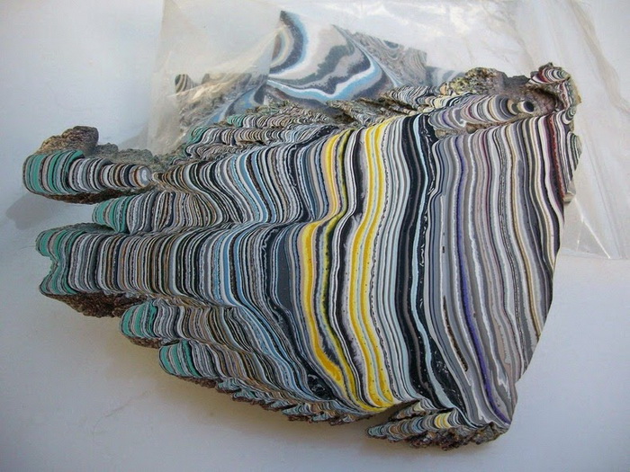 В Детройте есть несколько автомобильных заводов, на которых долгое время машины красили вручную. Разноцветная эмаль слой за слоем накапливалась в помещении, она-то, окаменевшая, и используется сегодня умельцами для изготовления оригинальных ювелирных украшений.