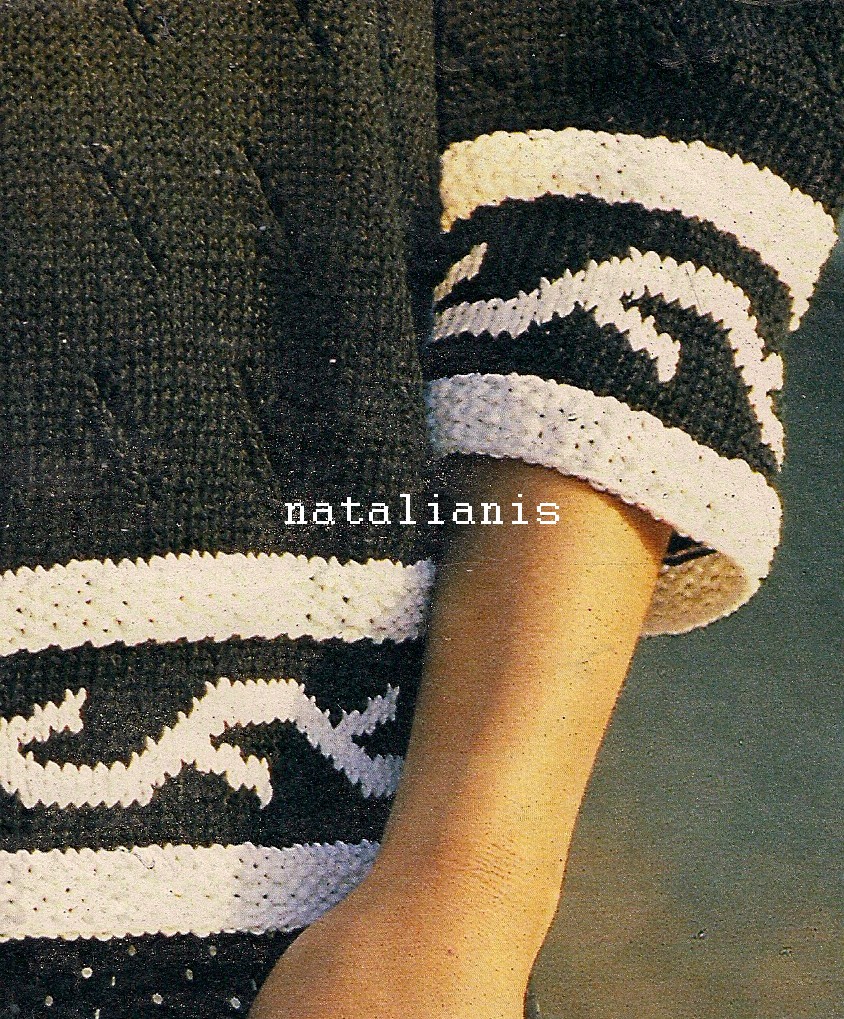 В модели интересно сочетаются вытачки с многоцветным узором. А заяц похож на пасхального.