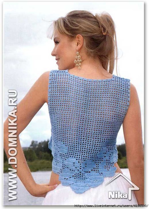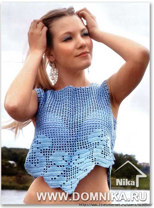 Блузка (можно увеличить) выполнена крючком в технике филейного вязания