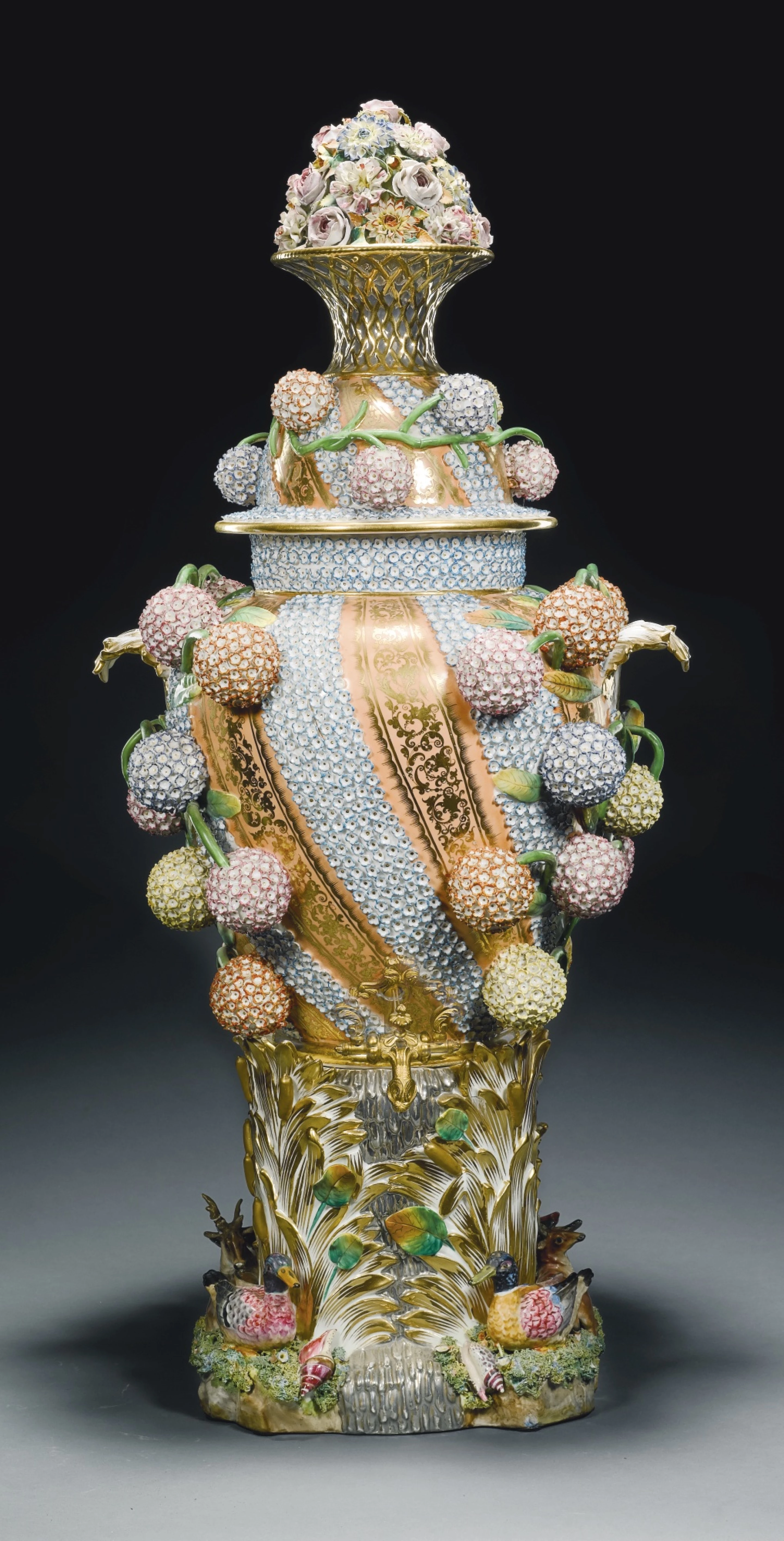 A LARGE JACOB PETIT GILT-METAL-MOUNTED FRUIT, VEGETABLE AND FLOWER-ENCRUSTED VASE AND COVER