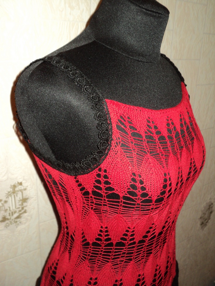 | Дальше прямо до 106 ряда. Все петли закрыла.В магазине купила чёрную,кружевную тесьму и оформила проймы-лямочки. |