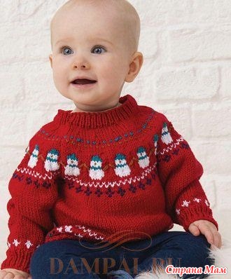 Детский джемпер создает новогоднее настроение благодаря рисункам снеговиков на кокетке.