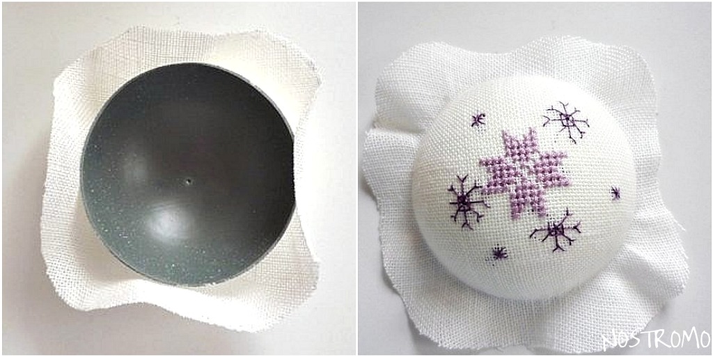 Из ткани с вышивкой вырезаем круги большего размера, чем нужно для оклейки половинок шара (лучше приложить ткань и померить "вживую"):
