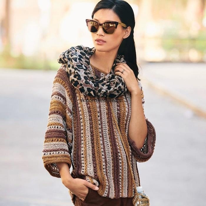 Джемпер из пряжи теплых оттенков земли связан поперек — от рукава до рукава.