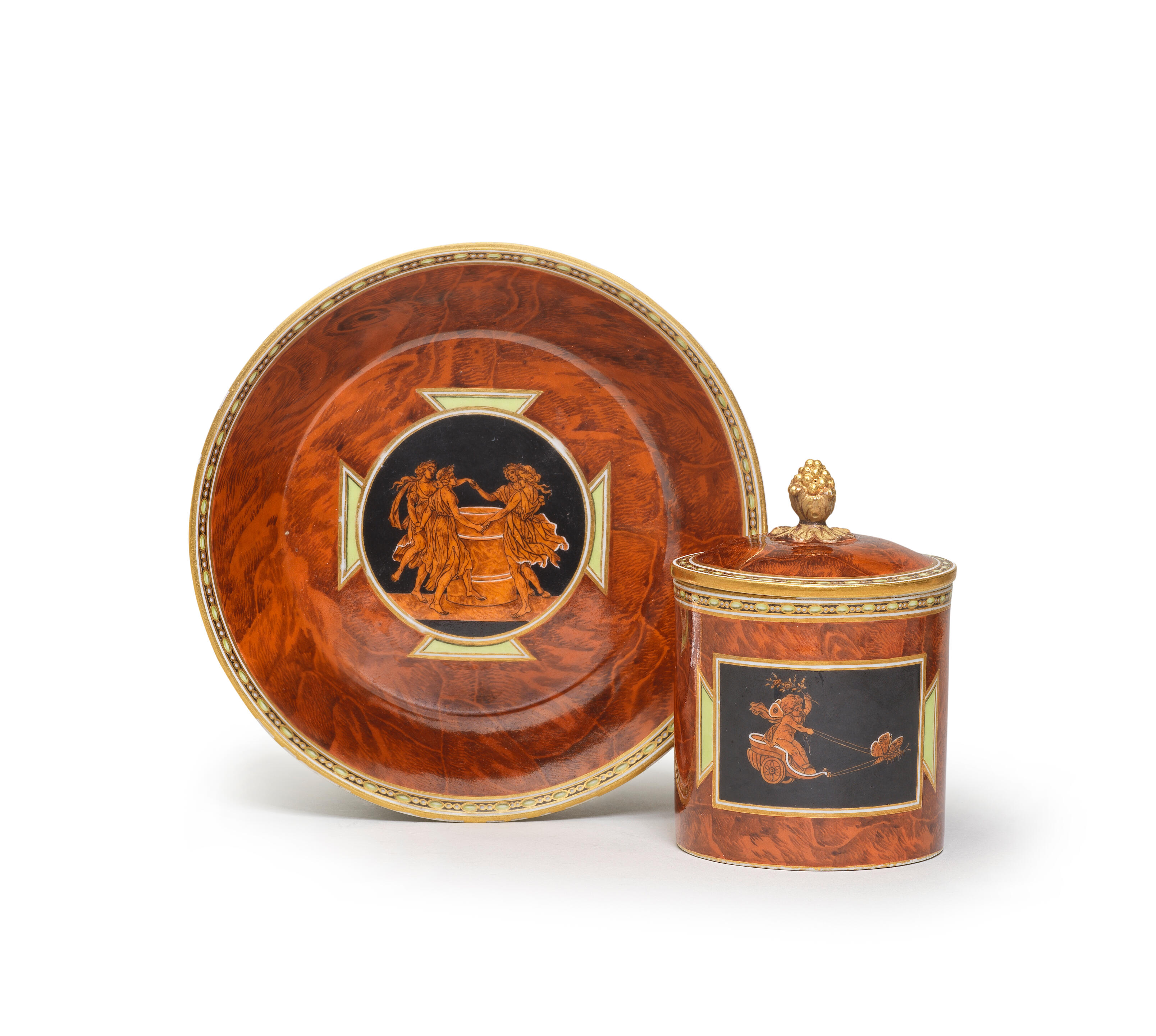 A Marcolini Meissen faux-bois-ground covered cup and saucer, early 19th century