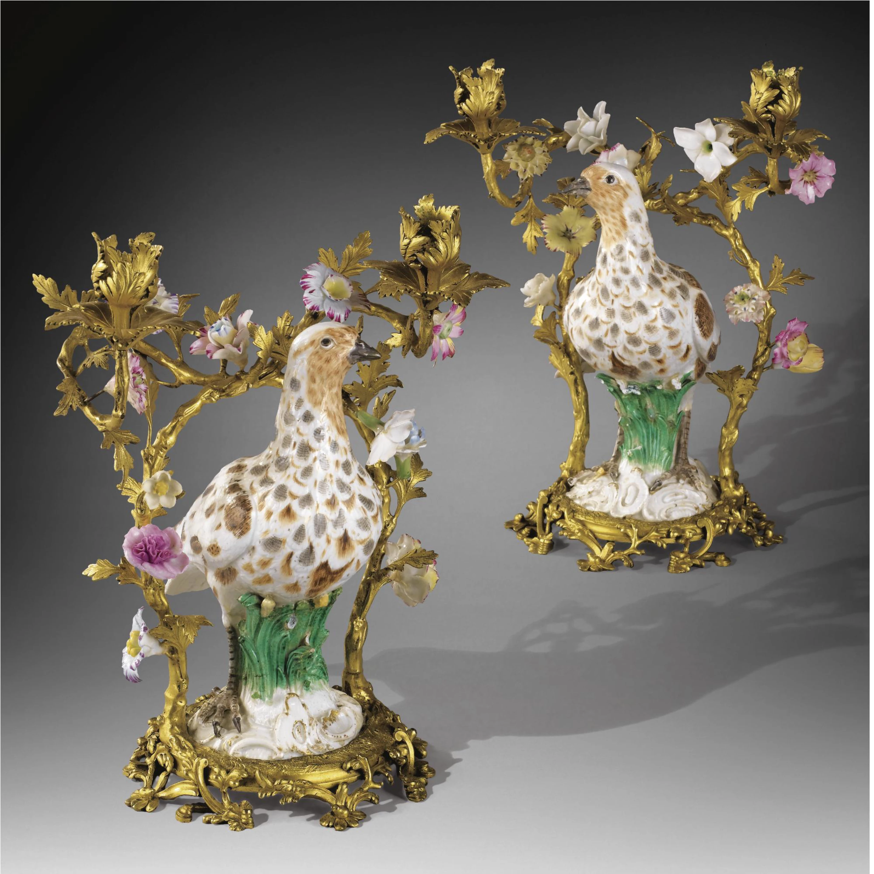 Paire de candélabres aux perdrix grises en porcelaine de Meissen vers 1750 à monture de bronze doré, travail probablement allemand d'époque Louis XV