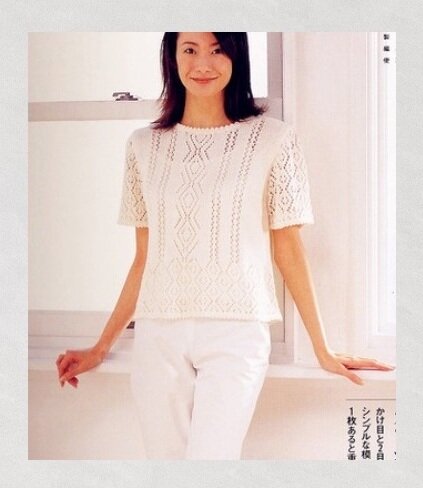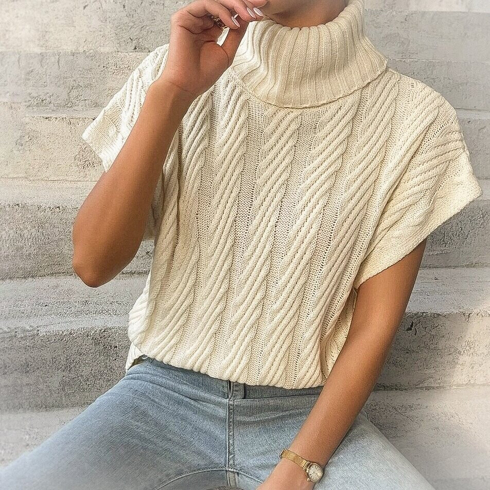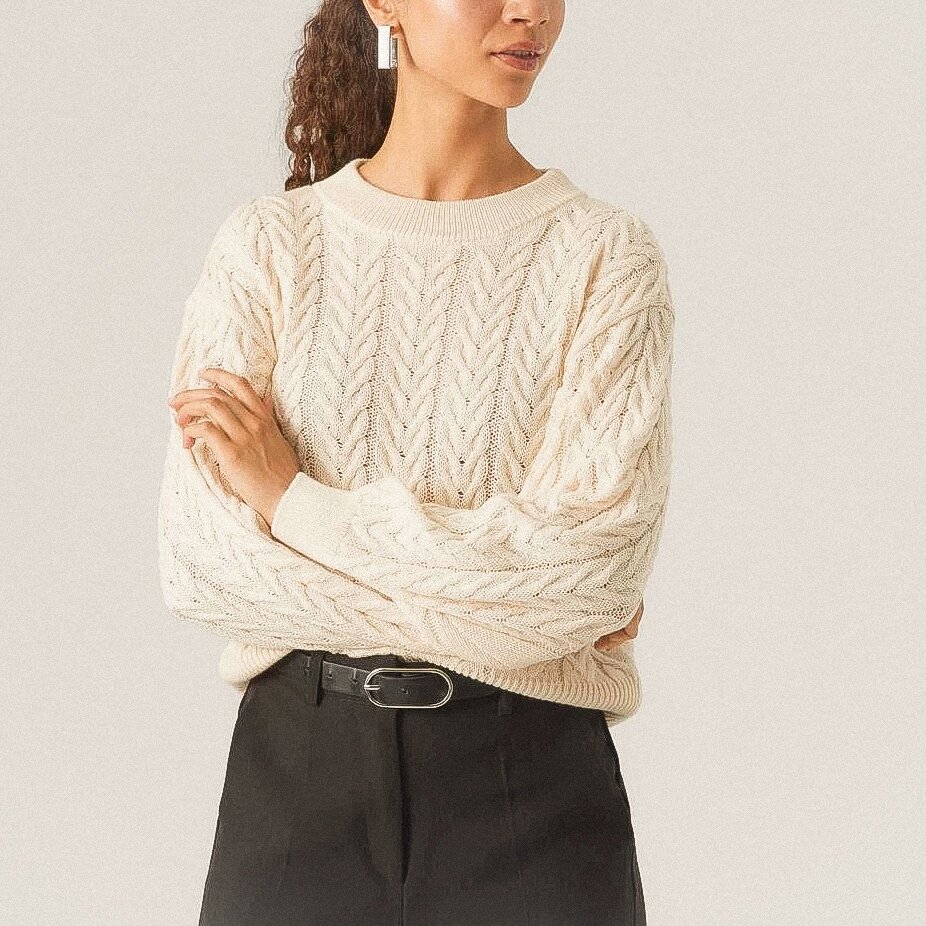 Кремовый джемпер украшен вертикальными двойными косами, разделёнными тяжами изнаночных петель.