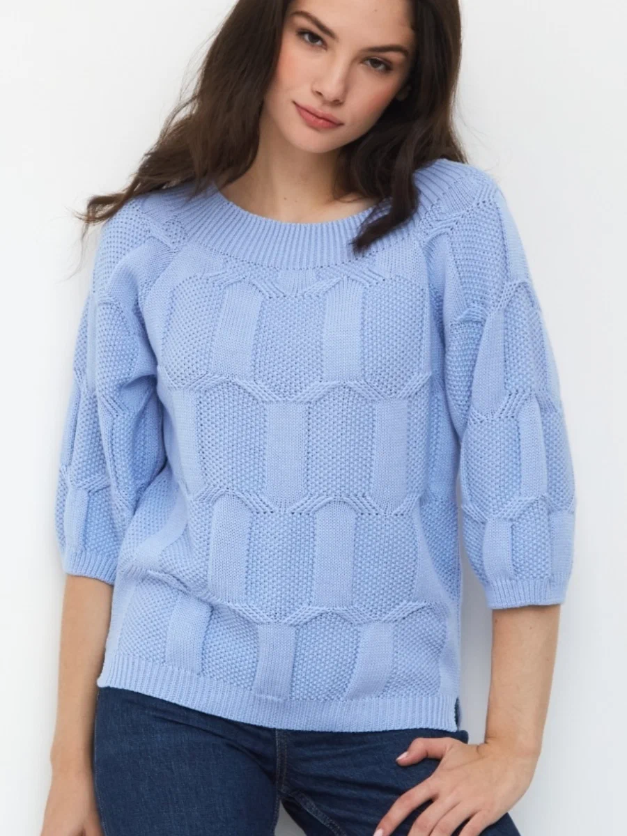 Предельно простая незатейливая модель прямого кроя со спущенными рукавами и круглым вырезом под горло. Вся изюминка изделия заключается в узоре, который вяжется совсем не сложно.